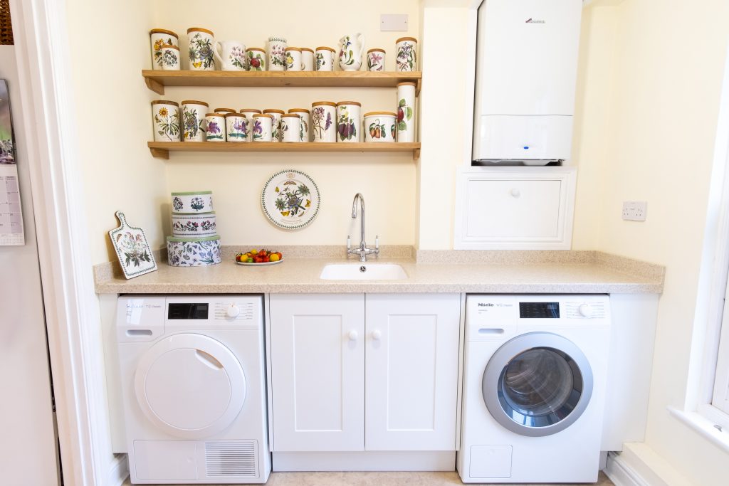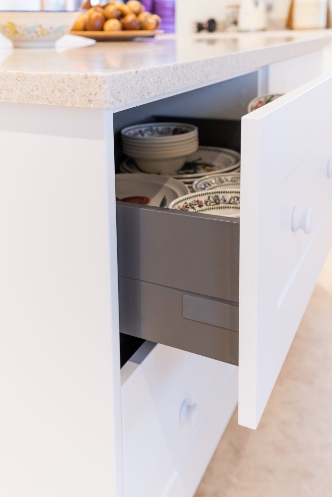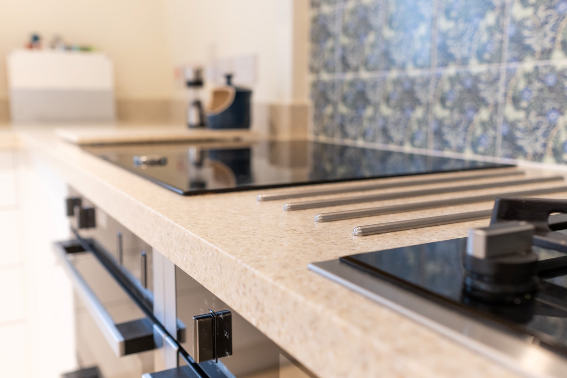 Sahara Corian was used for the countertop and upstands. Corian is a plastic that is mounted as one unit to the shape of the kitchen units. The sink is a moulded Corian sink. Available in many colours Corian provides a stunning finish with no joints! It's also very hard wearing.