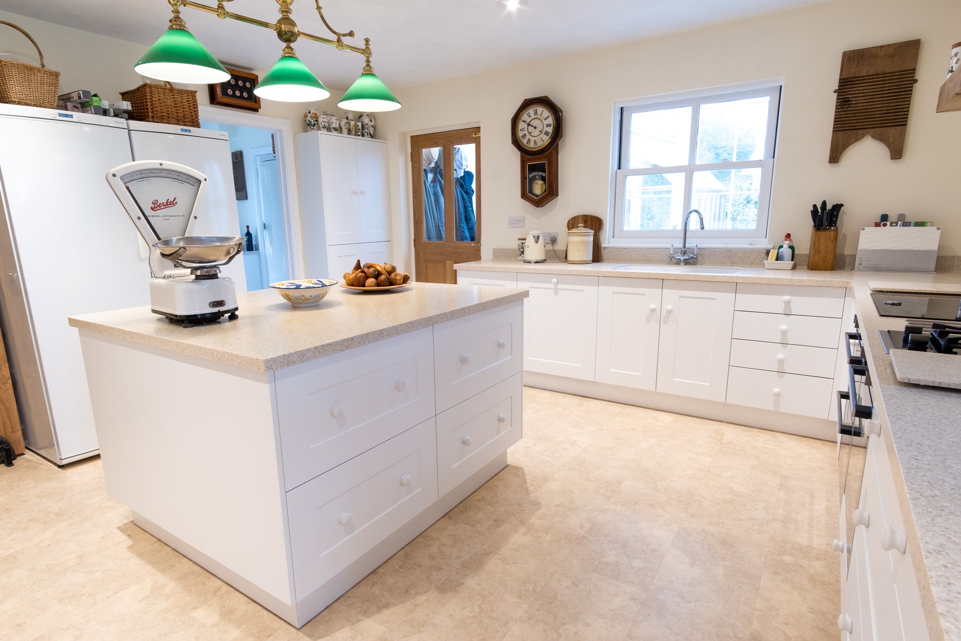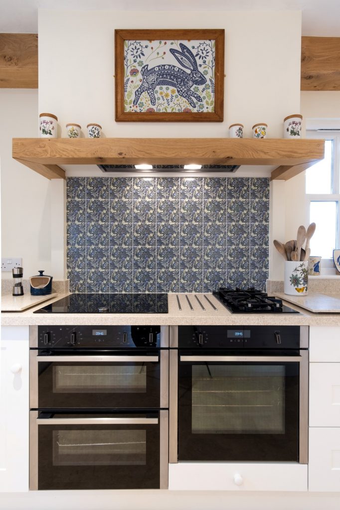 The oven and hob configuration are all designed by the customer (each oven/ hob was purchased singly and special units designed by us to house the configuration. Instead of all brought together. The Oak “Beams” are actually oak boxing to hide the pipe work.