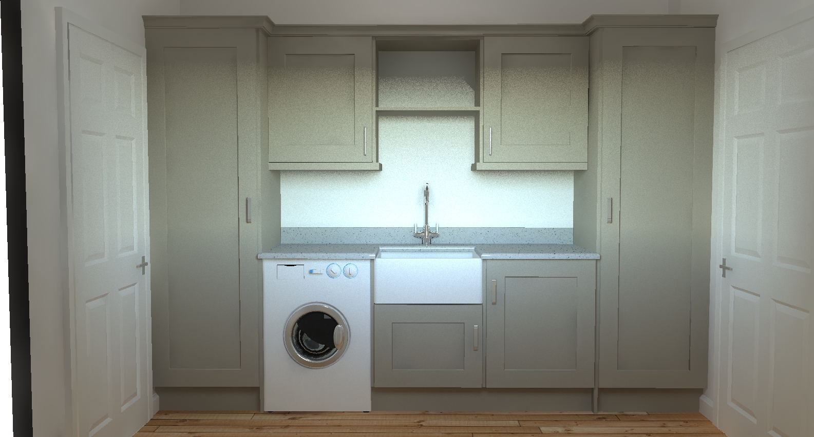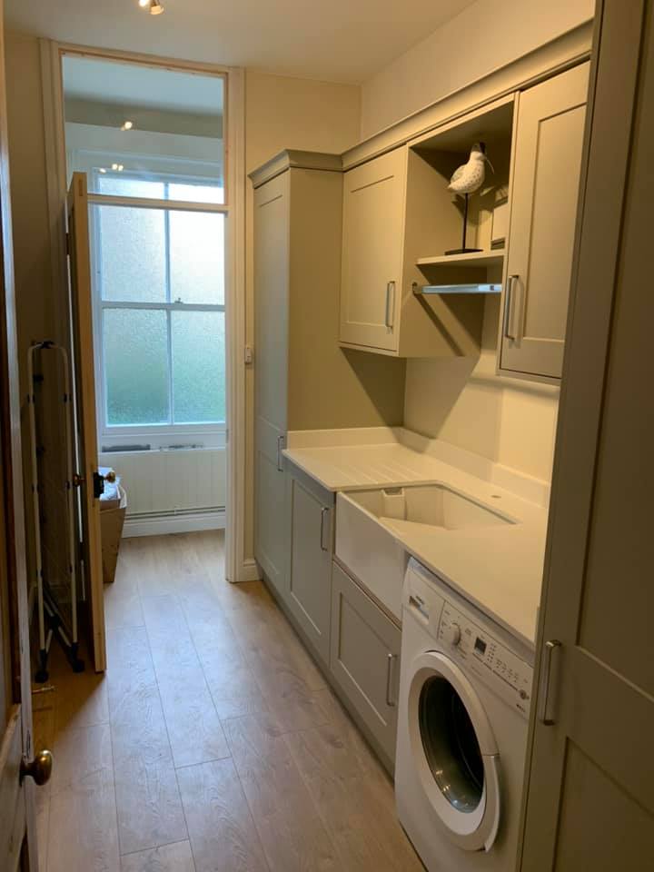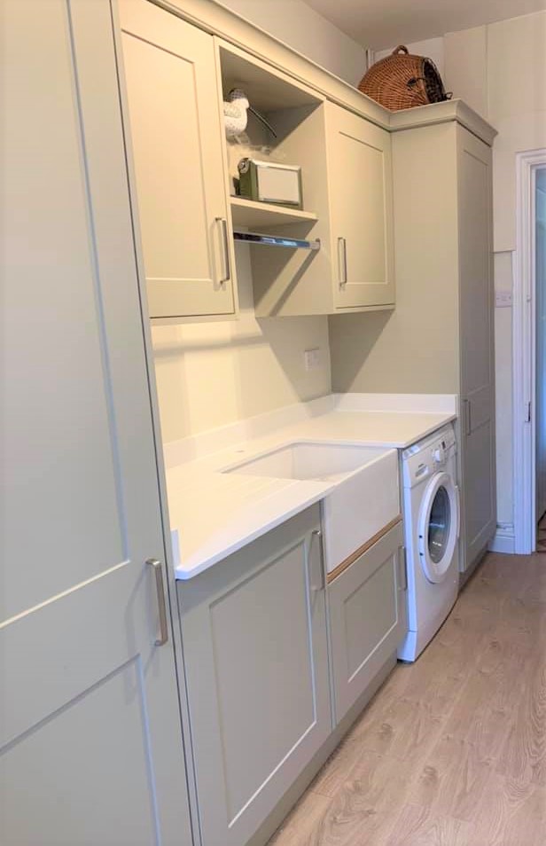 The doors are traditional Shaker Warsaw in Dakar, a soft sandstone colour. Handles used are Camden D, Brushed Nickel with soft close hinges. A Belfast (Ceramic) sink was added with a Brushed Steel Vologue twin lever mixer tap.