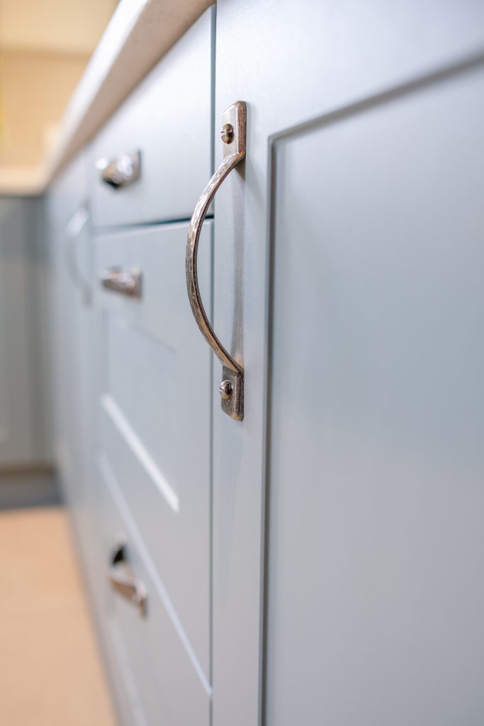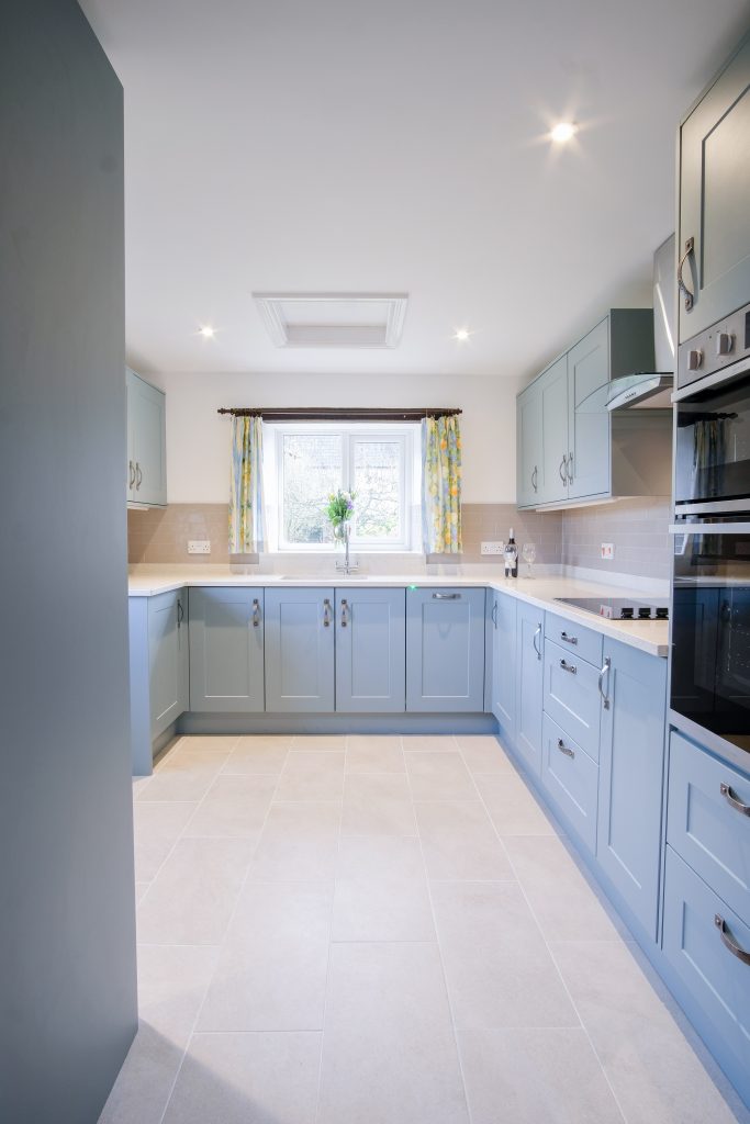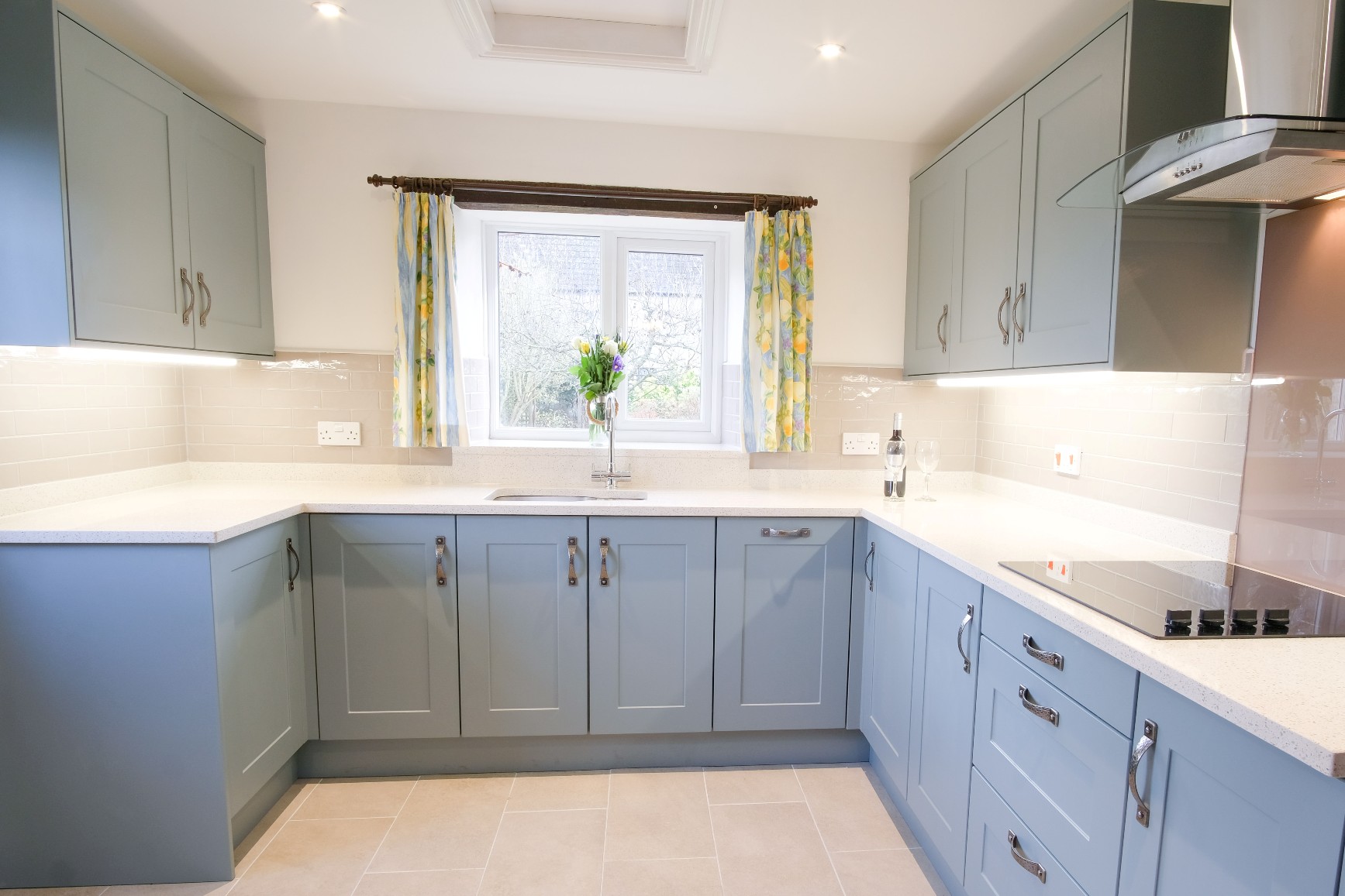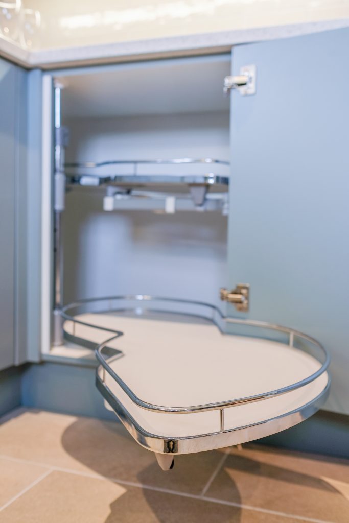The light blue colour is called Fjord and looks stunning on the Warsaw Shaker Design doors. The Work Top is made from Adirondark Birch Quartz and accommodates an undermount sink with drain groves. The handles are Hammered pewter handles and all doors and drawers have soft close drawer runners and hinges as standard. The Stainless steel undermount bowl and half sink comes with a swan neck frankie tap and pull out kidney shelves in the corner units make for easy access. Finished with under cupboard lighting.
