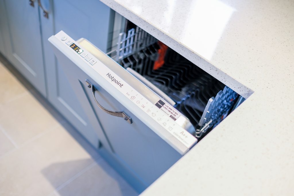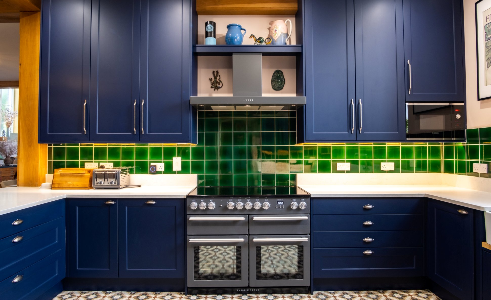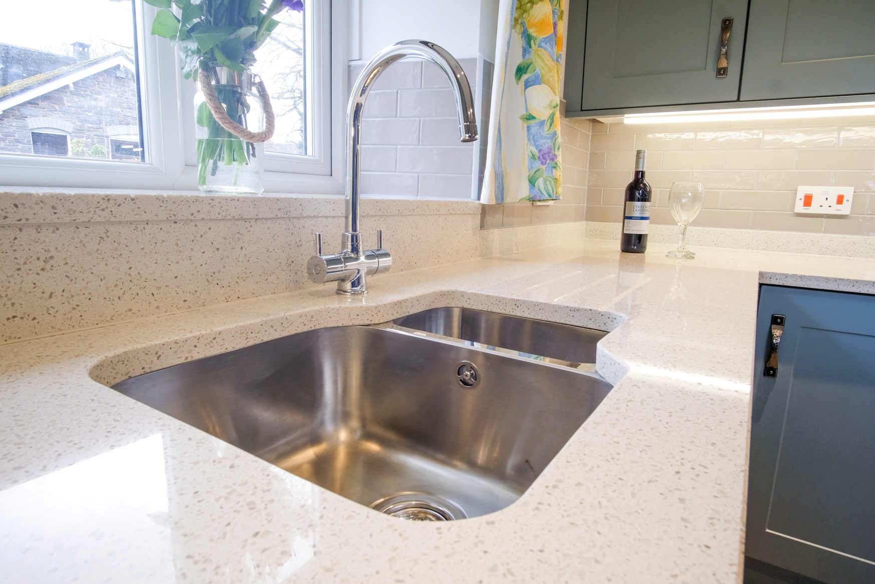 The light blue colour is called Fjord and looks stunning on the Warsaw Shaker Design doors. The Work Top is made from Adirondark Birch Quartz and accommodates an undermount sink with drain groves. The handles are Hammered pewter handles and all doors and drawers have soft close drawer runners and hinges as standard. The Stainless steel undermount bowl and half sink comes with a swan neck frankie tap and pull out kidney shelves in the corner units make for easy access. Finished with under cupboard lighting.